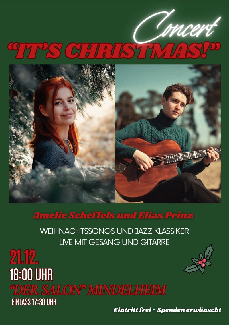 Das Duo – beide ausgebildete Jazzmusiker – verbindet feinfühlige Jazzstandards mit warmen, weihnachtlichen Klängen und schafft damit eine intime, gemütliche Atmosphäre kurz vor Heiligabend. Freuen Sie sich auf handgemachte Musik, ruhige Momente und einen Abend voller Winterstimmung – perfekt, um dem vorweihnachtlichen Trubel für eine Weile zu entfliehen.